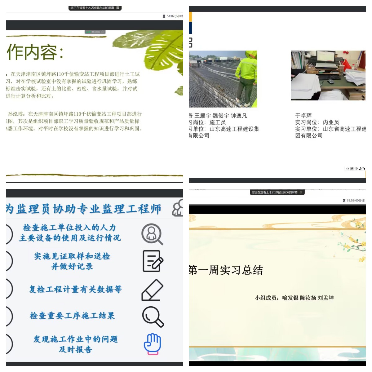 会议第一项,实习成果汇报。要求以小组为单位汇报第二周的实习情况以及有哪些收获,所有小组都能够按照要求每天完成工作日志,每周的实习周记以及成长故事素材的收集、建筑工程行为安全手册的撰写等相应任务,在实习的同时,数据处理能力和调查研究能力相应的有所提升,李微老师在学生汇报的过程中对学生的汇报内容进行提问以及点评,指出下次汇报的改进方向。