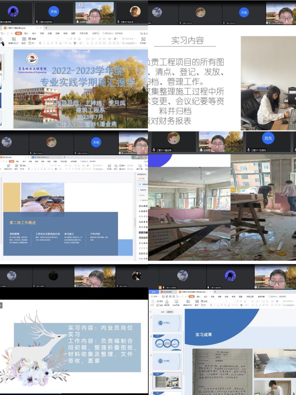 首先,指导教师王梓玮下发接下来两周需要完成的实习工作安排,从专业实践学期总结以及专业实践学期案例两方面进行分析和讲解。其次,本次实践周汇报由工管201班陆清新、工管202班秦宇航、工管202班刘天佑、工管211班潘金燕、工管211班汪竞先、工管222罗旭、工管222班李尧等七名同学进行汇报。以上同学从实习情况、工作内容、实习收获等方面进行总结汇报,通过PPT和WORD两种形式进行实习进度以及成果展示。在各位同学的精心准备下,积极主动、并能够正确回答指导教师所提出的问题。会议上营造了良好的交流范围。本次会议取得圆满成效。最后,由指导教师李月凤进行本周实习总结,她强调:实习过程中坚持安全放在第一位,要增强安全防范意识,提高自我保护能力,注意实习期间的工作安全和实习期间以外的人身和财产安全。同时珍惜和把握每次实习机会,享受实习过程,在实践过程中不断提升专业技能,对丰富个人案例以及增长专业本领起到关键作用。