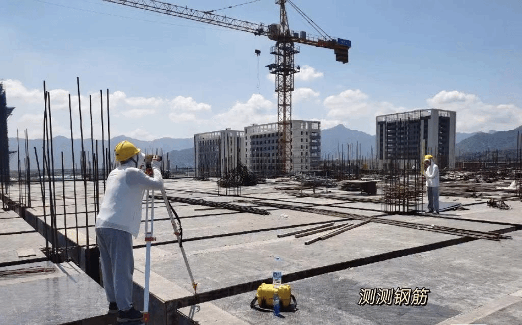 这是用水准仪测量钢筋,用来测量两点高差。水准仪主要是通过一条水平视线,并借助水准尺,来测定两点间的高度差,然后就可以由已知点的高程推算出未知点的高程。现在就是通过已知点的高程来测量钢筋的高程,然后好进行下一步工作。