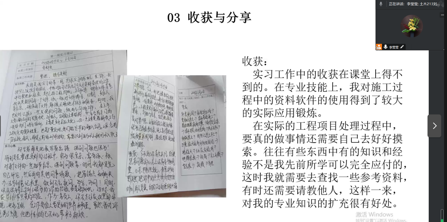 会议分为三个部分。首先各年级学生以小组形式进行实践成果的汇报。各小组都能够以认真地态度完成工作日志、实习周记等材料,坚持收集成长故事素材。汇报过程中,李莹莹老师对每个小组的汇报内容进行提问及点评并指出改进的方向。