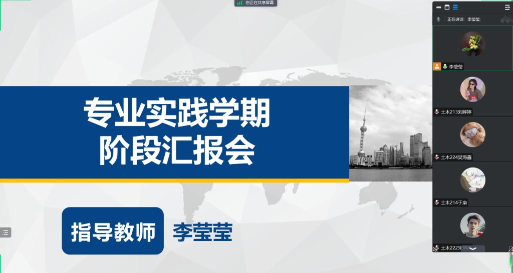 为确保专业实践学期有效开展,7月14日晚,土木工程专业指导教师李莹莹召开土木工程专业实践学期阶段汇报会,本次会议由指导教师李莹莹主持,土木工程专业同学全员参加。