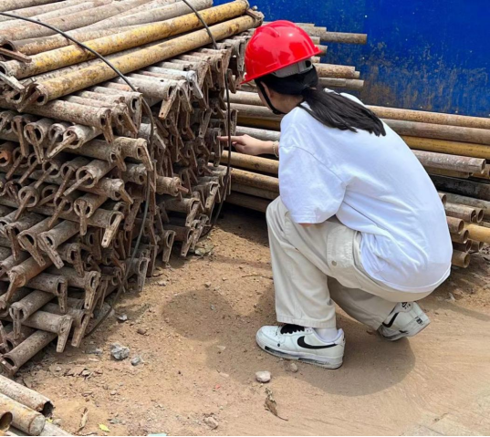 土木222潘静:本周任务是负责现场材料的数量的汇报和检验,负责钢筋的外观尺寸、重量偏差、拉伸强度、冷弯强度;但我主要负责钢筋材料的数量核对,钢筋品种有一级圆钢和二级带肋钢筋,而现场用的规格有10mm、12mm、16mm、22mm、25mm、28mm,我负责核算各个钢筋的数量并记录下来。