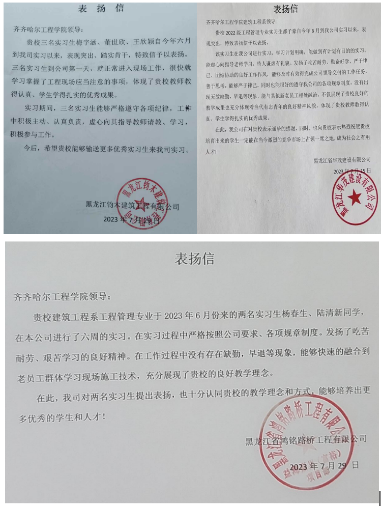 近日,工程管理专业收到多个实习单位送来的表扬信,工管221都子豪、王欣颖、梅宇涵、董世欣、工管212闫闯、工管202张宇军、孙凯芳、徐新雨分别在黑龙江华茂建筑工程有限公司、黑龙江钧木建筑工程有限公司、哈尔滨蜀兴建筑装饰有限公司、同江市盛世顺达建筑工程有限公司、黑龙江省国道西部二期工程项目管理有限公司、黑龙江省鸿铭路桥工程有限公司实习,实习期间表现优秀,被实习单位夸赞!