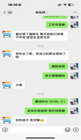 王健雅同学与老师进行了线上沟通,在聊天中询问了学校与老师们的近况。从而得知高中学校在毕业后发生了许多变化,增添了许多建筑,最近举办了很多活动,如学生合唱节、参观烈士陵园、排球比赛等,促进德智体美劳全面发展。此外,我还和老师介绍了大学生活,讲述了学校简介、校园风光、校园建设、学风教风、学习环境及专业设置。特别是与杨老师交谈过程中收获多多。通过这次交流,对于今后的人生的努力方向更加明确,这次母校回访活动非常有意义。