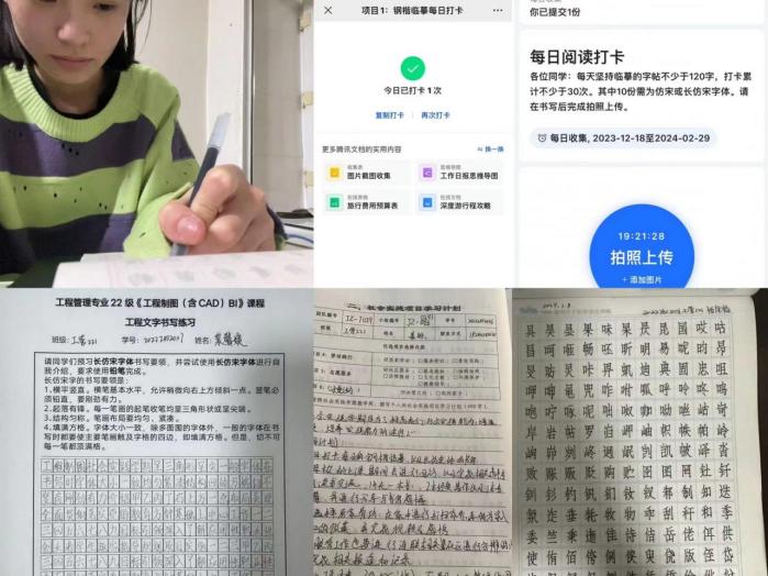 在这一周里,每位成员都按照既定的学习计划完成了每日钢楷临摹的书写并打卡,成员间互相督促、互相提醒,有效地提高工作效率。我们都深知,一个人的字迹是其外在形象的重要组成部分。写得一手好字,不仅能给人留下深刻印象,更是自身修养的体现,只是我们在平时很少能静下心来,练习写字。印象中,大一第一学期《工程制图A》课程要求我们按照国家标准书写长仿宋体字,以确保在手工绘制施工图纸时能够符合施工图的绘制要求和标准,这也使很多同学更加喜爱写字。在这次社会实践学期,又一次体会到写字的乐趣,感受写字所需的严谨与认真,让我们感觉自己离“职业人”的距离越来越近,也让我们有信心能够高效地完成这次社会实践学期的各项任务。