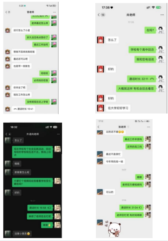 与母校老师进行沟通,均采取了线上回访。在与老师交流中,同学们询问了学校与老师们的近况,了解到学校的校园设施得到了改善,教育质量得到了提高,学校的声誉也在不断提升。看到教学楼、操场、图书馆,校园绿化、道路设施等都有了改善,很是开心,与老师回忆起上学时的学习、玩耍,有些怀念。同时,同学们向老师讲述了现在的大学生活,学校的建设历程、校园风光、校园建设、学风教风、学习环境及专业设置。