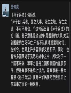 首先,第一周我们根据小组各自读书的实际情况制定了读书计划,每次读书时小组各成员都会相互提醒并在群里或者自己的社交软件上分享各自的读书心得。本次读书交流活动中武雪伟分享的书是《人性的弱点》,从中学到了只有学会真诚,才能赢得朋友的信任;在团队合作中,也可以更好地发挥自己的优势。胡帅分享的是《世界国宝传世之迷》,从中深刻地认识到了世界文物对各国的重要性,使得我们更加珍惜和爱护这些文物的来之不易;以后也会对书籍更加爱护和珍惜。贾俊岚分享的书是《孙子兵法》,从中了解到这本书辩证的哲学智慧,并且军事力量是立国和强国的重要条件,而我们学校也主张军事化教育;在读这本书的同时,也懂得了学校的悉心教导。李欣茹分享的书是《平凡的世界》,从中学到了时代变迁和人生的起伏,只有相信美好,生活才会美好。在学习的同时遇到困难不要气馁,克服困难。其次,在读书交流的同时也在每天打卡刚开临摹和长仿宋。