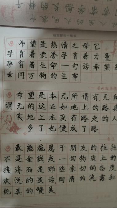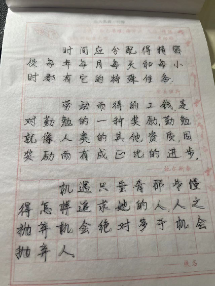 在本周,我们小组每位成员都分别完成了钢楷临摹的书写并进行每日的打卡,俗话说:“字如其人”。写字的过程就是学习做人。培育学习方法、习惯的过程,情感也会从中得到熏陶。练字就是磨练一个人的品性,练就一种处事之道。利用碎片时间临摹字帖,通过临摹“各类古诗词以及优美文章”等字帖,强化对中华文化解以及践行“写规范字、说规范话、做规范事”