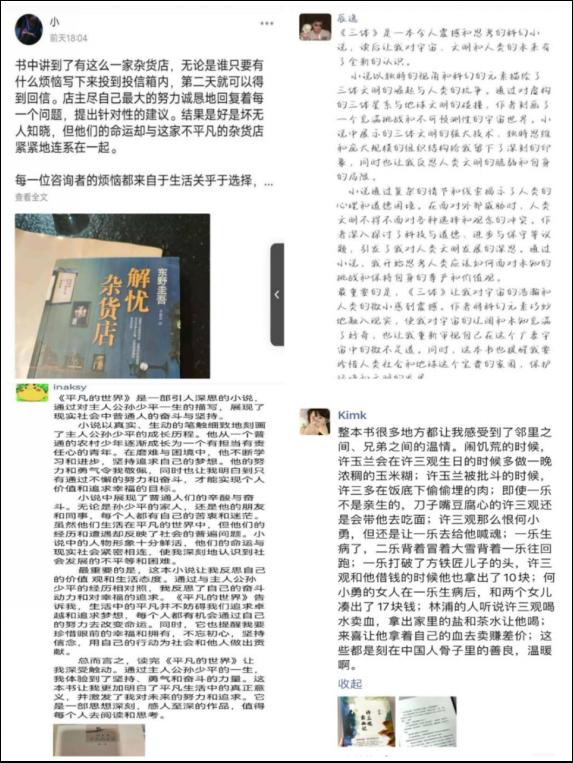 读书分享:小组的每一位成员都完成了第一本书籍的阅读与交流分享,同时在各种社交平台上分享了自己的读书感悟,读书可以收获知识、陶冶情操、丰富自己的文化底蕴和精神内涵,通过了解不同的书籍我们学习到了不同领域的知识,也更加丰富了自己的知识和见识。