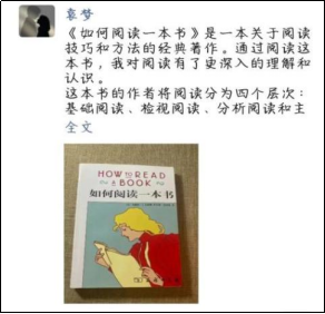 读书分享:小组的每个组员都完成了一次读书交流任务,同时在社交平台上分享了读书感悟,读书是获取知识和信息的重要途径。通过阅读各种书籍,我们可以学习到不同领域的知识,了解历史、科学、文化、艺术等,拓宽自己的视野和认知。