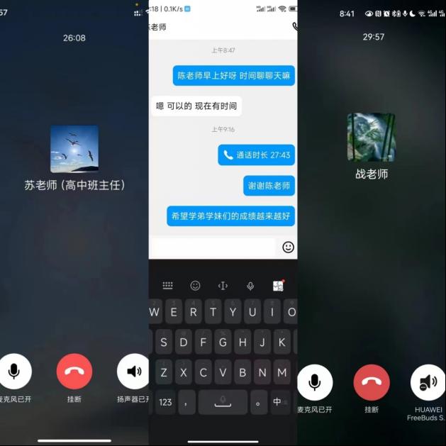 虽然已经阔别母校2年,但是听到老师声音特别亲切,想到曾经老师的教导和关心,好像还身处高中时期。我们都给老师汇报了大学两年的收获和成长,与大学老师和同学的相处,说明大学与高中学习的不同方式分享大学经验。并且祝愿学弟学妹们能考上好的大学。每个人也表达对老师感激之情,没有忘记过老师曾经的教导,高中的严厉才换来现在的知识水平和自立自强的性格。老师也对我们的成长感到欣慰,并鼓励我们在大学中不忘初心,努力学习知识,提高待人处世的能力,希望我们都能有一个好的未来。