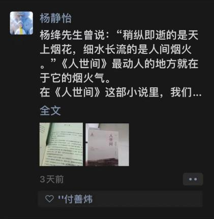 小组的杨静怡同学阅读和分享书籍《人世间》:我印象最深的一句话是“在我看来,读书是无悔最好的良药,它可以踏实地对得起时间的蹉跎,更可以充实的给我们带来收获——让我们包容世间百态、明辨是非曲折、忠于真实自我。”大学的生活给了我们足够的自由和自主权,我们可以全权规划自己的大学生活,除了上课我可以参加社团活动,可以跟朋友相约出游,我们总说不负韶华,时光荏苒,时间就像手里的沙,在不经意间就从指缝中流逝,大学的生活应该是美好而惬意的,读这本书,让我重新定义了时间,重新审视了我得大学生活,它得美好里面应该有为梦想和未来奋斗的模样,应该有树立良好的人生观价值观成熟的模样,应该有坚持自我不人云亦云的模样。这本书给了我很大的心灵触动,它让我尊重时间,尊重人生。