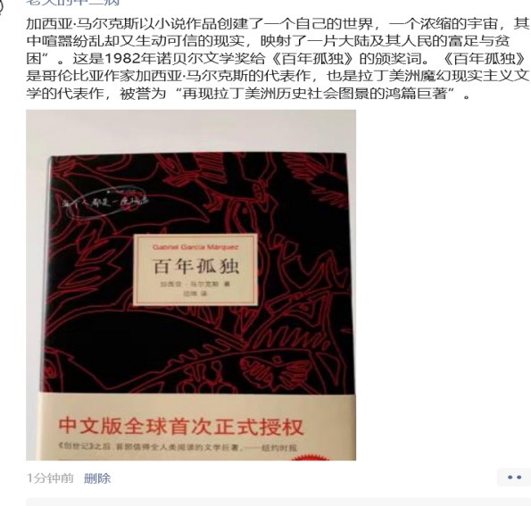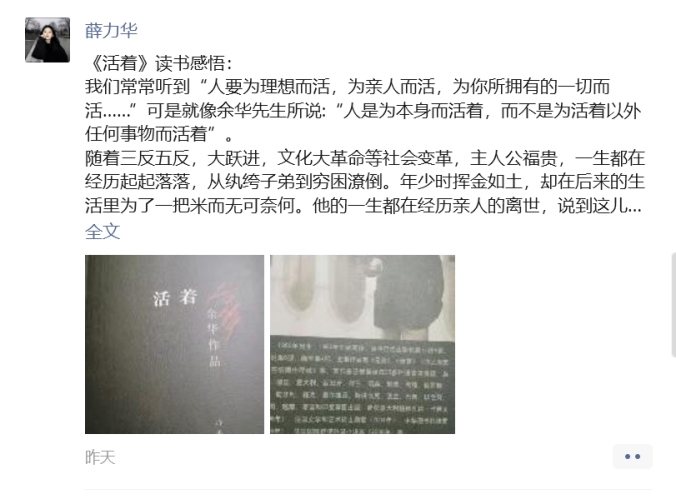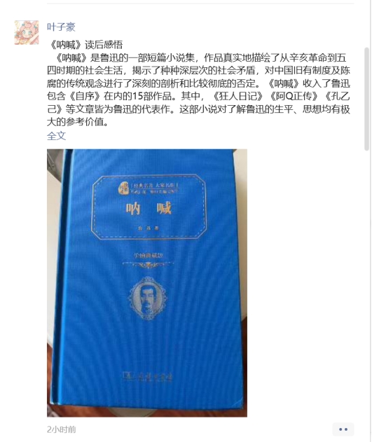 本周叶子豪读了《呐喊》,薛力华读了《活着》,陈思楚读了《百年孤独》。尽管每个人读的书目不同,但大家一起通过网络进行读书交流,引发思想的交流碰撞。他们每个人还将读后感发到了各自的微信朋友圈。