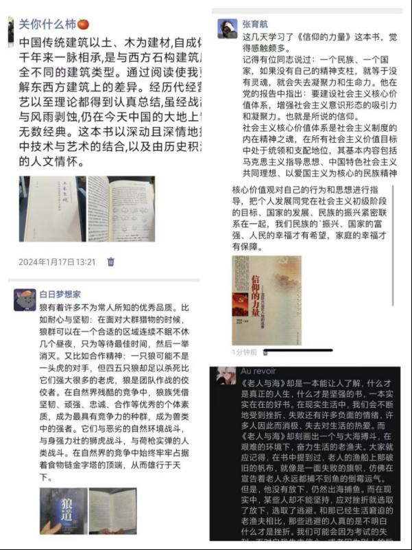 除了钢楷临摹任务,这一周,小组成员还在朋友圈中进行了读书分享。正如莎士比亚所说:“一千个读者有一千个哈姆雷特”,通过阅读书籍,我们从中获取知识,形成了正确的人生观、世界观和价值观。通过接触不同时代的名著,小组成员们能够接触到不同的文化思想,从而拓宽了视野,培养了审美能力。