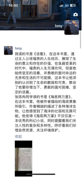 韩明洋同学读的书是《活着》,在这本书里,通过主人公徐福贵的人生经历,展现了生命的意义和存在的价值,在急剧变革的时代中,福贵的人生充满坎坷,但是他始终坚定的活着,并勇敢的面对命运的无奈和生活的不可捉摸,这本书让他深刻的认识到了生命的脆弱和可贵,教会了他要珍惜当下,勇敢的面对困难,坚定的活着。