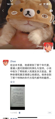 赵睿博同学读的书是《许三观卖血记》,在这本书里,他感受到了那个年代里,普通人面对困境时的挣扎与坚持。小说中他为了帮助家人和朋友多次卖血,那种亲情和真实情感让他感动。他体会到了那个特殊的年代与现代都市的截然不同,也由衷的感叹短短五六十年的时间中华民族的伟大复兴进度之快。