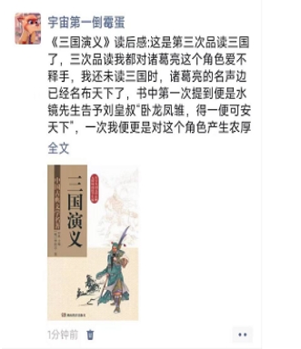 接下来是读书交流完成任务情况,截止到目前,该小组伏牧雍同学、彭云卜同学均已完成一本名著阅读,其中伏牧雍同学所读名著为《三国演义》,他说道:“这已经是第三次回顾这本经典名著了,每一次回顾都能有不同的感受,这一次我感受到了数不尽的遗憾,诸葛丞相的壮志未酬、周公瑾的既生瑜何生亮、凤雏先生的以身入陷为主师出有名等等,遗憾是贯彻人生的,我们应当重在当下。”而彭云卜同学所读名著为《追风筝的人》她认为书中塑造的阿尔米是个懦弱胆小自私的人,是个小人,背刺朋友自己却软弱无能,但最后在救出哈桑之子后解除了自己十几年来的心魔拯救了自己受伤的良知,彭云卜同学感慨道:“这就像我们的人生,也会经历软弱无能,但是我们要勇敢去面对生活,只有对生活充满希望我们才会有光明的未来。”
