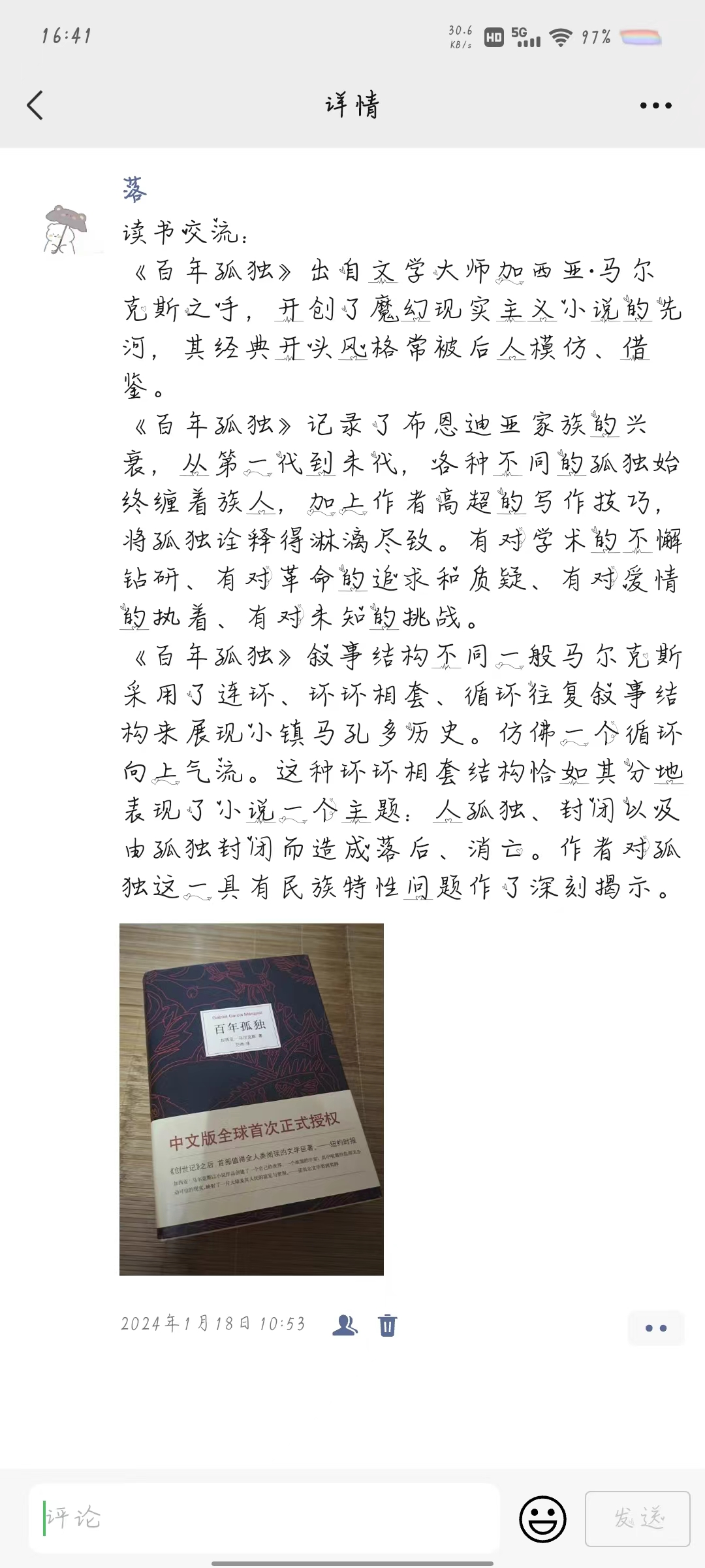 小组成员张佳怡本周在家阅读了《百年孤独》这本书,并在2024年1月18日在朋友圈进行了读书分享。这本书描述了各种不同的孤独始终缠着族人,有对学术的不懈钻研、有对革命的追求和质疑、有对爱情的执着、有对未知的挑战。主题为,人对于孤独、封闭以及由孤独封闭而造成落后、消亡。作者对孤独这一具有民族特性问题作了深刻揭示。
