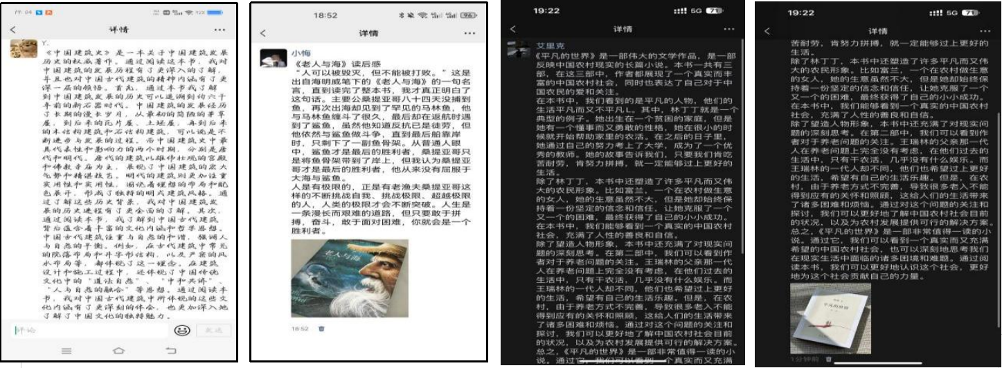 读书分享:1月24日,张紫嫣,隋环宇,艾炎博完成了第三次名著阅读与感悟分享,书籍是人类进步的阶梯,阅读专业性的书籍《中国建筑史》对本专业有了更深的认知,对今后专业课的学习有很大帮助。阅读文学性的书籍《老人与海》或《平凡的世界》提高了自身文学素养。在阅读与分享的过程中,组员们都从书中获得了不同的收获。