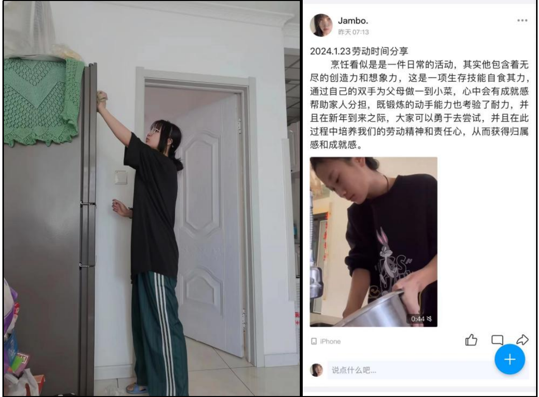 居家劳动:1月23日,张紫嫣,施丽瑶进行居家劳动,通过帮助家里分担家务,做饭,打扫卫生等从中体会了劳动的意义。