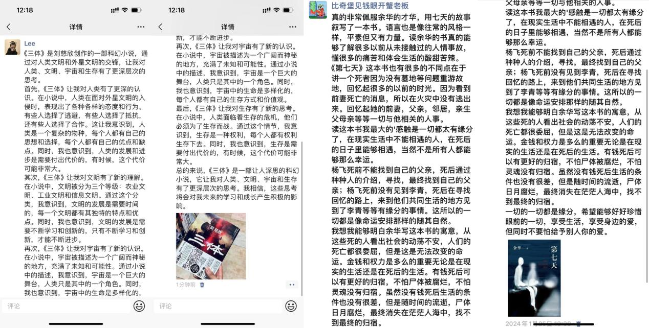 李俊琦同学本周读了刘慈欣的《三体》,他也与同学们进行了读书感悟的交流——宇宙是多元化的,每个人都有自己的生存方式和价值观;人类面临生存危机,要为生存而战;这本书可以引发对人类、文明、宇宙和生存更深的了解。