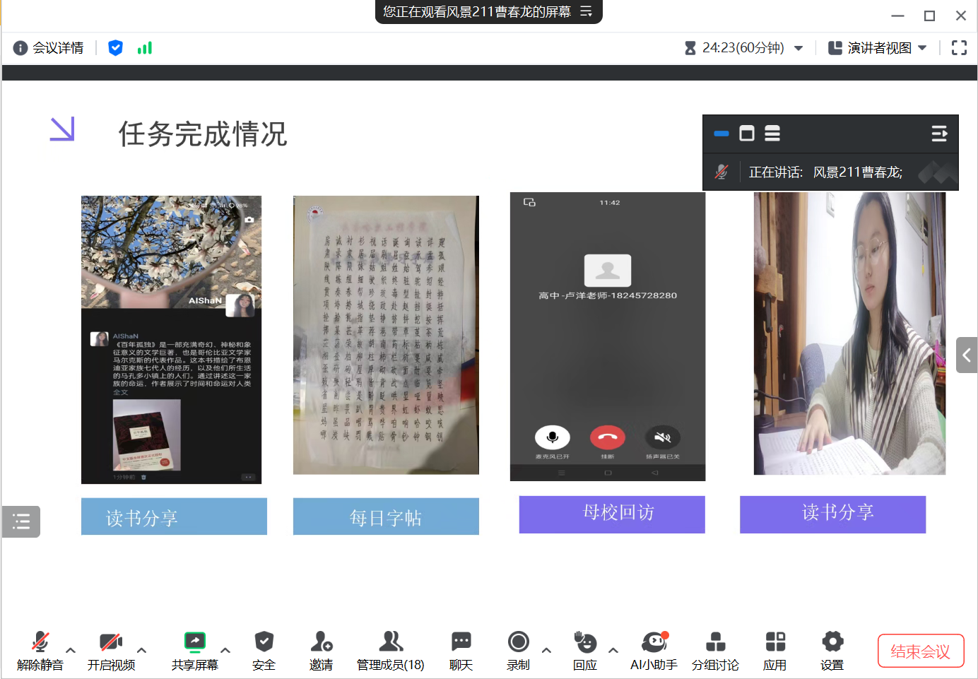 会议伊始,主持人强调了社会实践学期的重要性和意义,并指出这是培养学生实践能力、提升综合素质的重要环节。随后,各小组代表分别进行了阶段总结汇报。他们详细介绍了各自小组的本周实践内容、进步以及亮点等。同时,他们也分享了实践过程中的一些感悟和体会,如团队协作、沟通交流、解决问题等方面的能力提升。最后,生涯导师袁继杰对各小组的阶段总结汇报进行了点评和总结。肯定了各小组在实践中的努力和成果,并鼓励学生们在未来的实践中继续发挥创新精神和实践能力,为社会发展做出更大的贡献。同时,袁继杰老师也对各小组提出了一些建议和期望,希望他们能够在今后的实践中不断改进和完善自己的工作方法和思路。