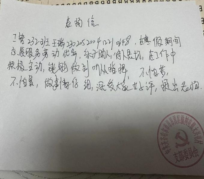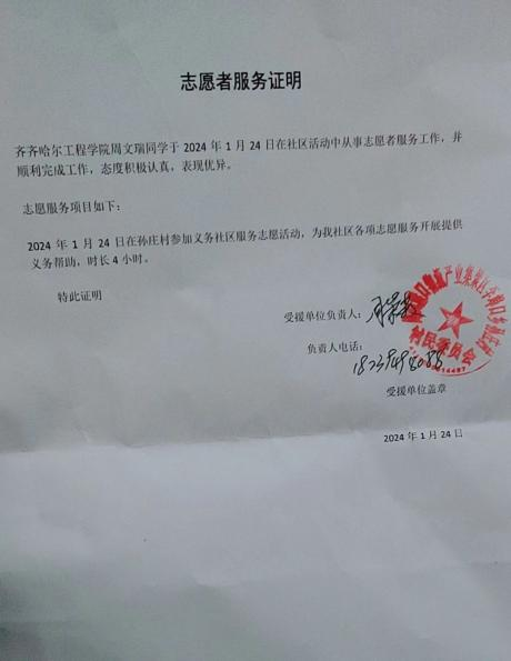 参与志愿者活动,让我们深刻体会到人生的美好与充实。在敬老院,我们看到了孤寡老人坚韧的生命力,学会了珍惜当下;在环保宣传活动中,我们认识到地球是我们共同的家园,环保责任人人有份;在助学活动中,我们明白知识改变命运的力量,也更加珍惜求知的机会:在文化传承活动中,我们感受到了民族文化。大学生志愿者等各类志愿服务队伍比较活跃,成为社会主义精神文明建设的重要力量。 2024年1月24日周文瑞同学参加了孙庄村义务社区服务志愿活动,2024年1月20日王瑞同学参加了齐齐哈尔市昂昂溪区志愿服务活动。活动中两位同学听从指挥,吃苦耐劳,特此委员会给予表扬信和志愿者服务证明。
