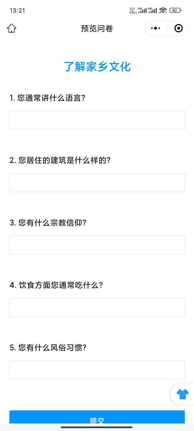 小组成员刘子豪在本周对自己的家乡新疆巴州尉犁县开展家乡调研活动,首先通过发放调查问卷的形式来初步了解家乡的语言特点,建筑于居住文化,宗教信仰,风土人情,饮食文化,风俗习惯等方面,通过此方式能够对自己的家乡有初步的认识,更希望大家可以了解自己家乡的特点。
