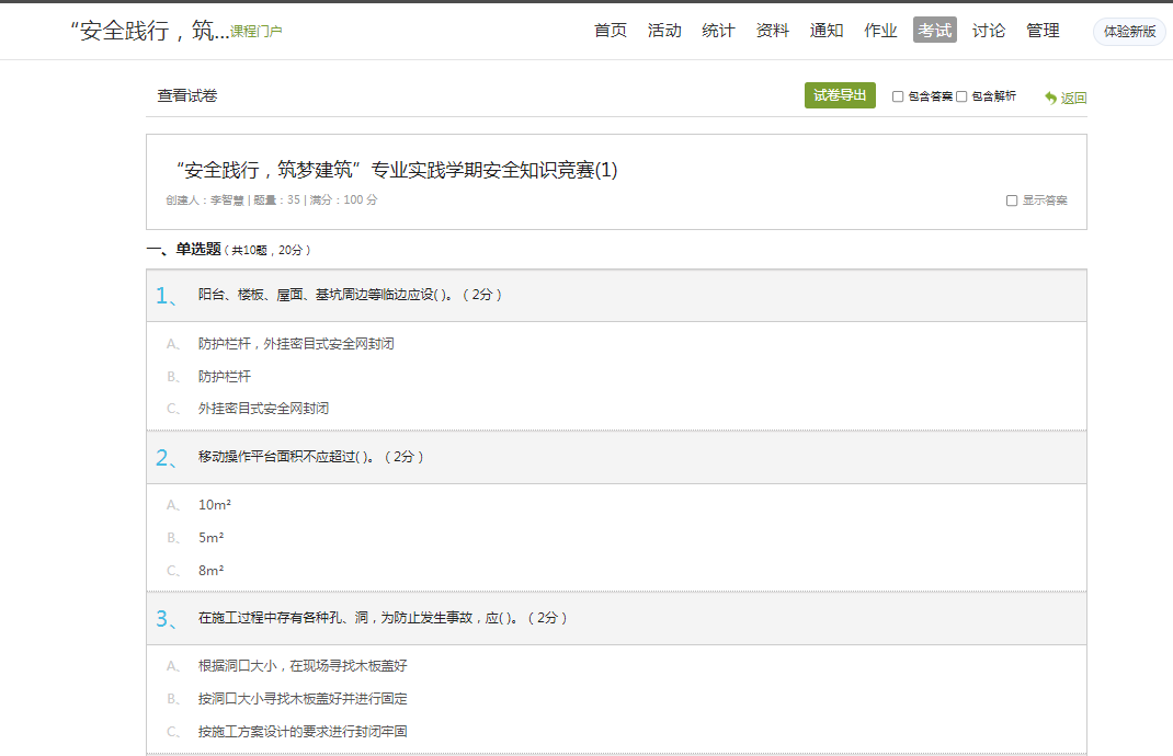 在7月25日,进行“安全践行,筑梦建筑”专业实践学期安全知识竞赛,共计150人参与比赛,本次大赛以大力普及安全知识,进一步提升学生安全意识和应急能力,营造良好安全氛围为目的,进行集中线上答题,题型分为单选、判断、填空以及多项选择题,主要涵盖了涵盖安全生产法律法规、安全操作规程、特种设备、个体防护、应急救援等方面,全方位、多角度检验学生安全知识,让学生深入了解和掌握安全知识,将安全生产理念融入日常生活和学习中,增强安全意识和自我保护能力。