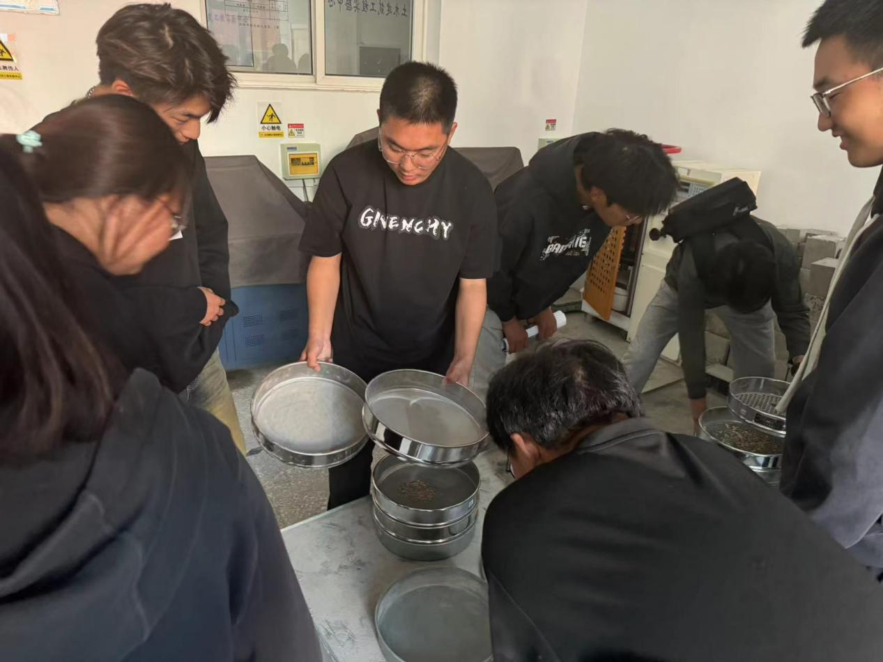 在实验检测环节,张晓庆老师带领学生进行了骨料的筛分析实验。学生们亲自动手操作,通过对骨料的筛选和分析,深入了解了材料的特性和工程应用。