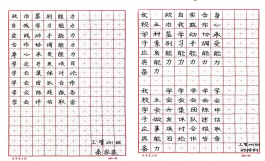 最后,统一收集各同学书写作品,并由郭磊老师与朱同威老师为比赛评选,他们本着公平、公正、公开的原则,对同学们的优秀作品进行了认真评审。评审标准包括书写规范、字体美观、布局合理等方面。