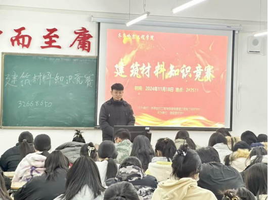 为提升大学生逻辑思维能力,培养建筑管理工程系学生对建筑建造职业的兴趣,同时通过趣味性竞赛形式,激发学生对建筑材料的学习热情,提升学生们的专业素养和实践能力。建筑管理工程系建宸建筑学社于11月18日至20日在2号教学区2511教室举办“齐齐哈尔工程学院2024-2025学年度首届环保材料创新创意模型设计大赛“赛项一”:建筑材料知识竞赛”活动。本次活动分四场,共计300人参加。