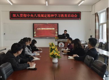 为进一步加强作风建设,推动全面从严治党向纵深发展,3月31日,土木工程专业教师党支部在二号教学区2409会议室召开深入贯彻中央八项规定精神学习教育启动部署会议。本次会议由土木工程专业教师党支部书记贺全德主持,支部全体党员参加会议。