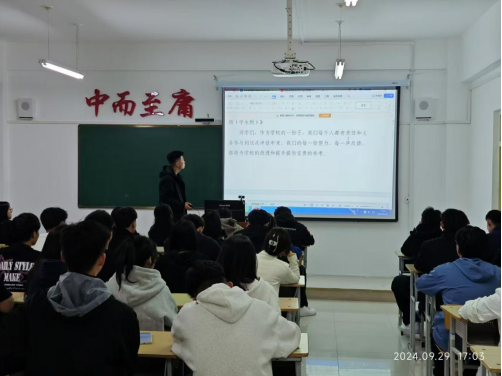 紧接着,财管213魏贵明学长就学生如何准备迎接新一轮审核评估、学生与评估专家可能的交流场景、学校教育教学的独特之处及人才培养模式等方面,进行了详细讲解。之后魏贵明学长带领我们进行了《本科教育教学审核评估知识手册(学生版)》的朗读。他明确指出同学们要认清自己的责任,规范个人行为,并详细说明了在新一轮审核评估期间以及专家入校评估时的具体做法和注意事项。学长特别强调,希望全体同学能够提升思想认识,确保对评估工作有充分了解,认识到评估对学校和个人发展的至关重要性。并希望同学们严格遵守学校规章制度,以高昂的热情、良好的精神状态、严谨的学习态度和文明的行为表现,积极参与到学校本科教育教学审核评估的各项工作中去。