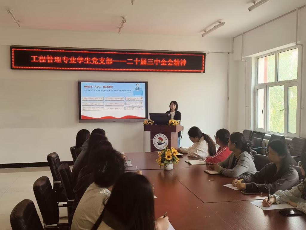 在党的二十届三中全会精神指引下,为进一步提升支部党员的政治理论水平和思想觉悟,工程管理专业学生党支部于9月10日以学习党的二十届三中全会精神为内容进行了党课学习。由工程管理专业学生党支部书记蔡爽同志主讲,全体党员参加。