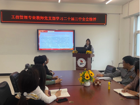 为深入学习贯彻党的二十届三中全会精神,建筑管理工程系工程管理专业教师党支部于9月29日在二号教学区2409会议室组织开展“学习党的二十届三中全会精神”主题党课,由建筑管理工程系工程管理专业教师党支部书记李俊进行宣讲,工程管理专业全体党员教师参加会议。