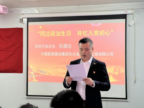 重温入党誓词后,中国能源建设集团东北电力第二工程有限公司项目经理、党支部书记党员张德志同志代表中国能源建设集团进行发言。张德志书记从“为什么入党?入党后能做些什么?”的问题开始引人思考。他用自己的亲身经历,给全体党员生动诠释了,什么是信仰。在发言中他说:“人生在世,总要有一种信仰支撑我们,有了信仰,就有了动力;有了信仰生命征程就有了旗帜和明灯。”在接下来的发言中他从高度的政治责任与政治意识角度追忆了自己的入党初心,他将对党的忠诚转化为对建筑事业的热情,对齐齐哈尔工程学院建设项目产教融合,校企合力育人的热情。并表示今后将以高度负责的敬业精神,用工作成绩践行自己的入党誓词与初心。