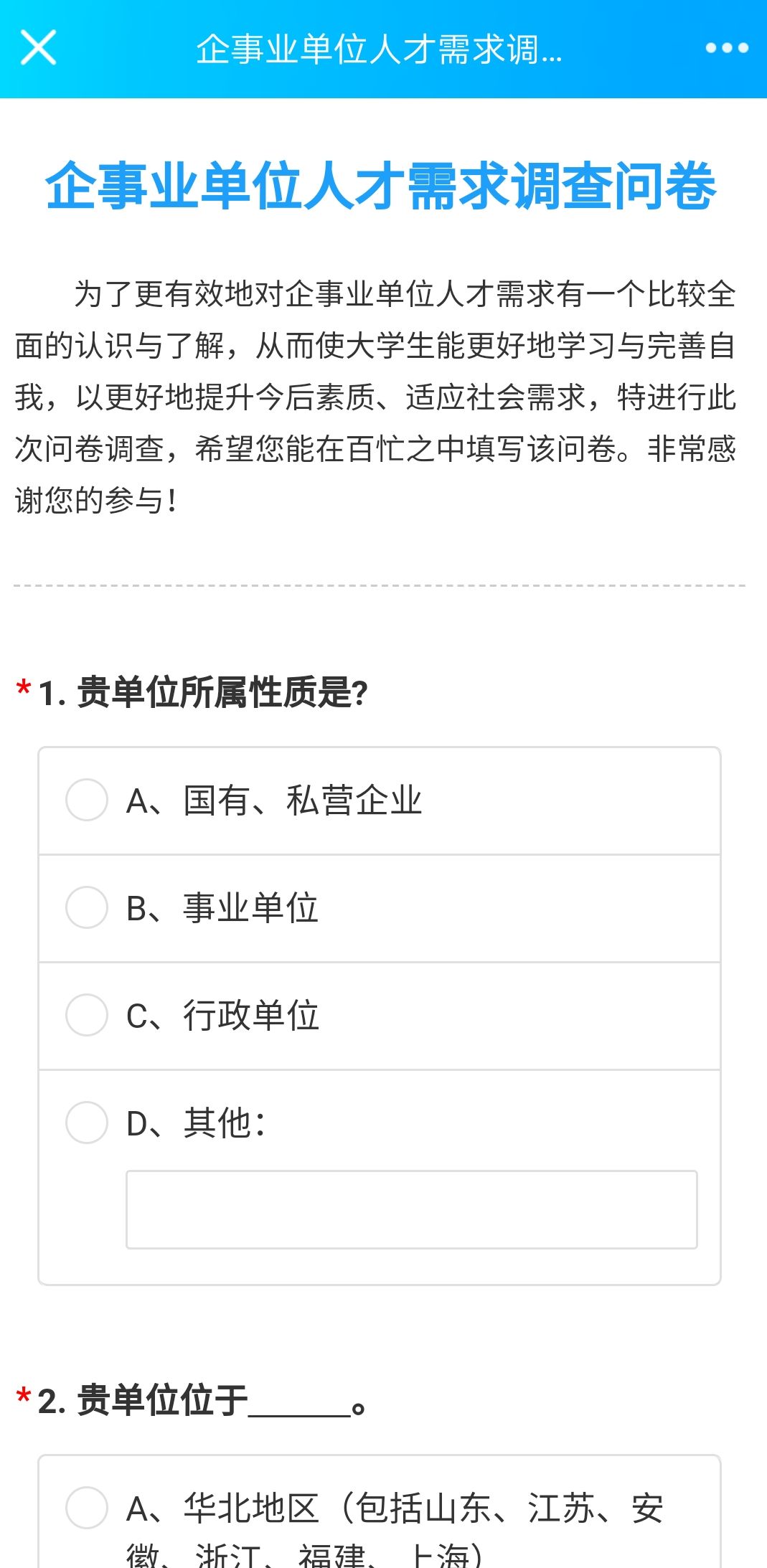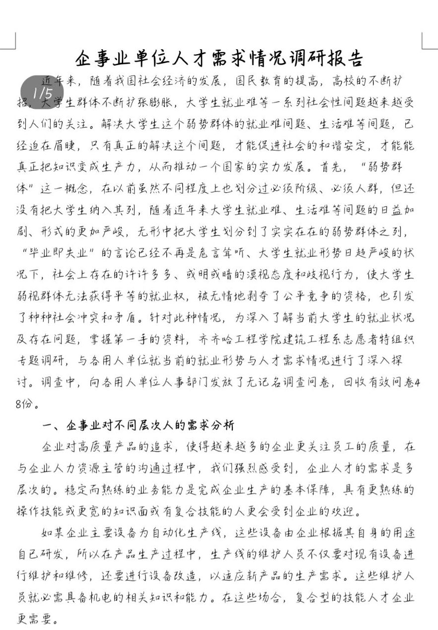 此次活动采取线上调研的方式进行,共回收有效问卷48份,主要对全国部分地区企事业单位人才需求情况进行了解。据调研数据显示,企事业单位注重文凭,看重经验,同时有些企业也存在性别、生源地歧视。本次活动不仅增强了同学们对企事业单位的认识,还使同学们认识到完善自我的重要性。最后在各小组成员的共同努力下,使得此次活动取得了圆满的成功。