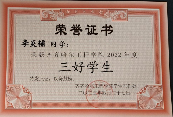 李炎辅通过勤奋学习,积累了丰富的知识和经验,因此荣获了多项荣誉证书。他坚信“树高千尺,其根必深,江河万里,其源必长”这一座右铭,并以此作为自己的座右铭,引导自己在学术道路上不断前行。作为共青团员,他以更高的标准要求自己,定期进行学习总结,不断优化学习方法,以确保自己的学习效果达到最佳。李炎辅同学以初心和热爱为动力,保持对学习的虔诚和信仰,不断追求卓越,最终必将取得辉煌的成就。