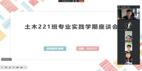 为进一步掌握学生实习信息,确保专业实践学期劳动教育落实与安全防线稳固,土木221班于7月27日召开了专业实践学期座谈会。指导教师徐明首先听取了学生关于实习单位情况的汇报,继而针对本专业实践内容与实践学期安全问题展开了系统讲解与具体指导。