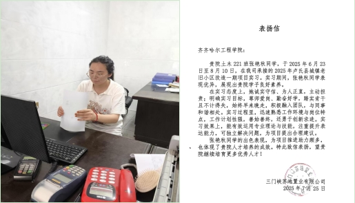张艳秋在三门峡苏地置业有限公司实习期间担任资料员,参与2025年卢氏县城镇老旧小区改造一期项目相关资料工作。她经手项目文件2000多份,坚持接收、整理、归档各核对一次,未出现差错。日常除整理归档项目资料,还协助工程师调取历史资料,自己制作了关键词索引表,加快了资料调取速度,保障项目资料流转顺畅,优异的表现获得实习单位的表扬,获得表扬信一封。