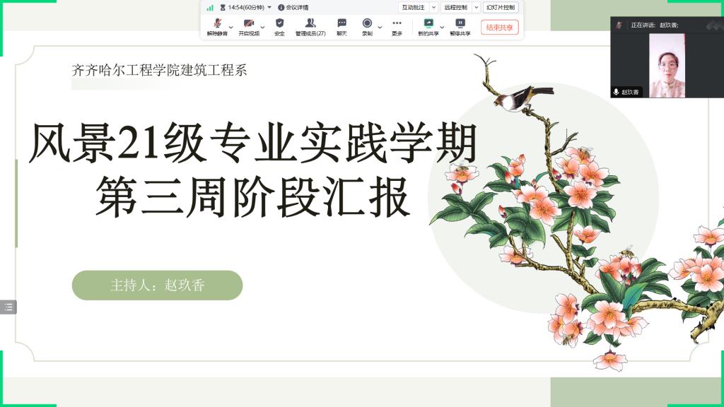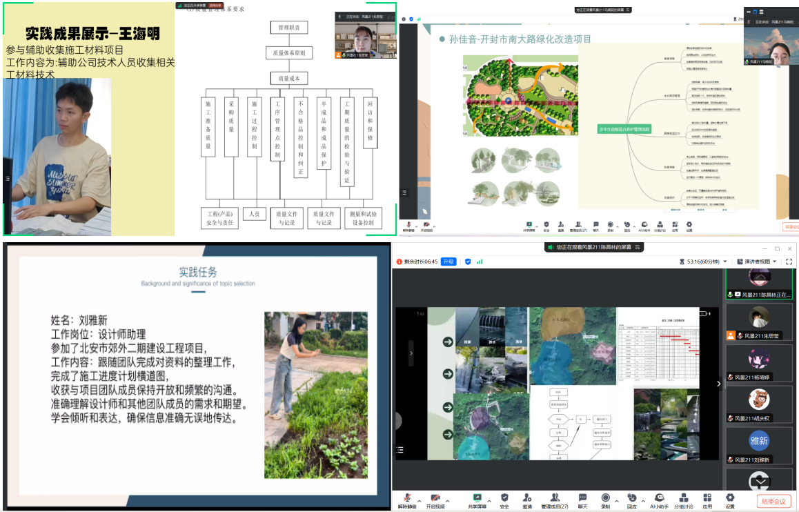 2024年7月6日上午,在风景园林专业21级学生迎来实践学期第三周之际,他们于汇报会上以严谨认真的态度,一一展示了各自在实践项目中所取得的丰硕成果,并深入分享了各自的心得与体会。腾讯会议室内的氛围既热烈又庄重,每位同学脸上都洋溢着对专业知识的深厚热爱和对实践活动的满腔热情。此次会议由风景园林专业21级的实践指导教师赵玖香主持,全体同学均积极参与其中。