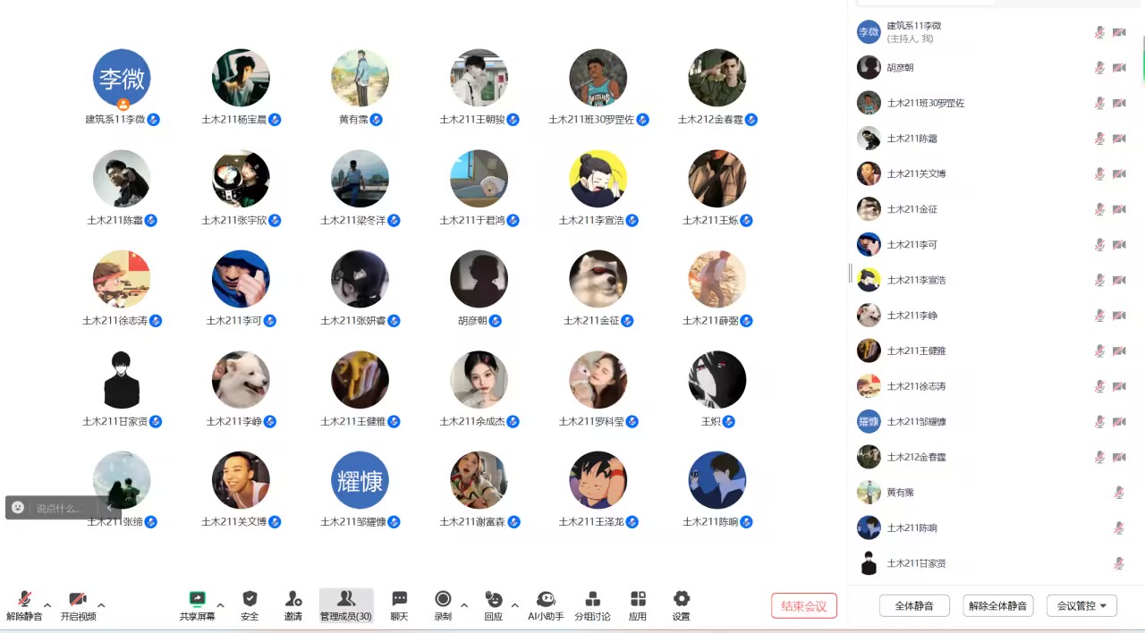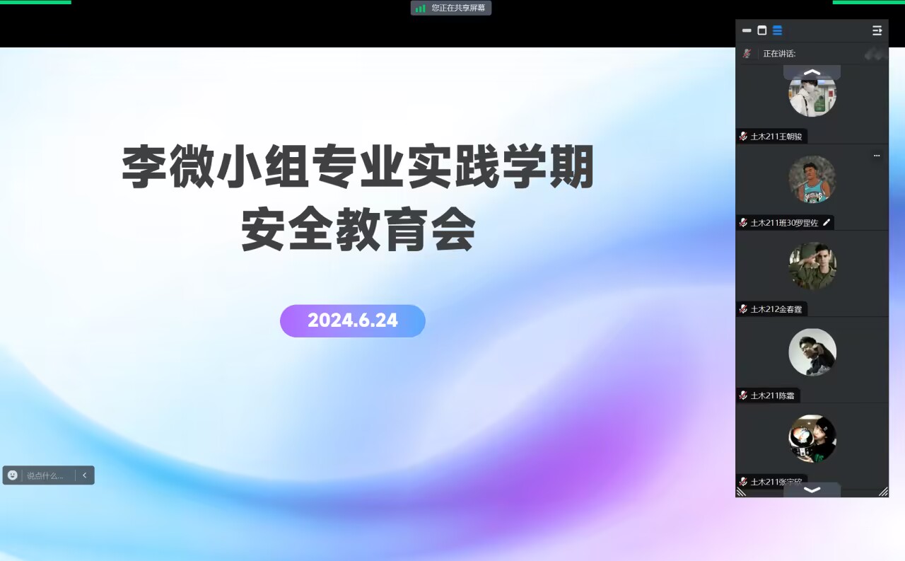 为了进一步加强学生的安全意识和劳动意识,确保专业实践学期能够顺利完成,6月24日晚在腾讯会议召开专业实践学期安全教育会,会议由指导教师李微主持,土木211班全体同学参加。