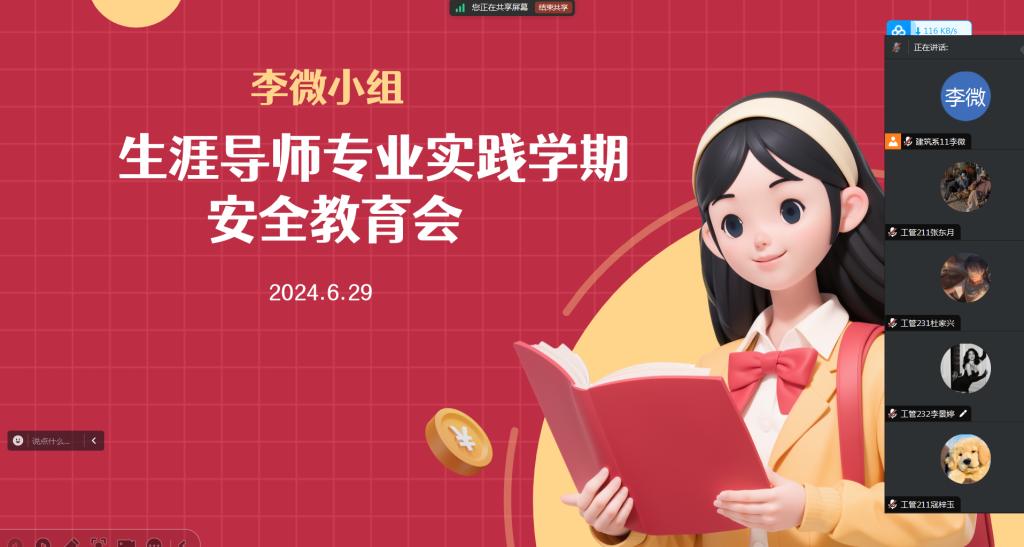 为了提高专业实践学期学生的安全意识,确保专业实践学期能够顺利完成,6月29日,生涯导师李微在腾讯会议召开专业实践学期安全教育会。会议由生涯导师李微主持,全体生涯小组学生参加。