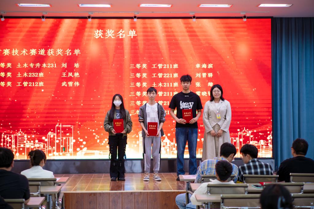 大会伊始,建筑工程系各专业的老师们悉数到场,共同见证了这一荣誉时刻。会上,工程管理专业老师李俊老师代表教师团队进行本次竞赛的总结,宣布了获奖名单。在5月25日,在哈尔滨工业大学举办第十五届黑龙江省“龙江杯”大学生先进成图技术与产品信息建模创新大赛中,建筑工程系代表队的刘培、王凤艳、武雪伟在先进成图技术赛道个人赛中荣获二等奖;章海滨、刘晋驿、张缔、霍晓钰、谢婧、胡帅等6人获三等奖。在智能建筑结构设计赛道中,章海滨、谢婧小组获三等奖;刘培、王凤艳、武雪伟、章海滨、刘晋驿荣获建筑类先进成图团体三等奖,其5人代表建筑代表队入围全国总决赛。