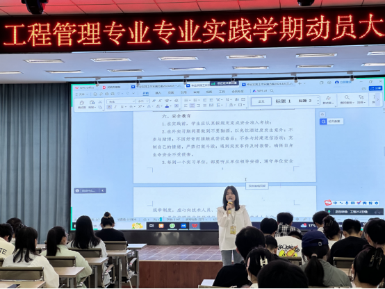 大会伊始,曲梦露老师讲解专业要求。她以丰富的实践经验为背景,深入浅出地为21级、22级、23级学生讲解了实践工作中的注意事项。实践目的和意义、劳育要求、实践成果、考核标准等,曲老师强调:专业实践学期不仅是对我们所学知识的应用,更是对职业素养和团队协作能力的全面考验。在这个阶段,学生将深入建筑公司、施工现场、实验室,亲身感受职场的氛围,了解建筑行业的运作机制,将课堂上学到的理论知识与实际操作相结合,从而更好地理解和掌握专业知识。