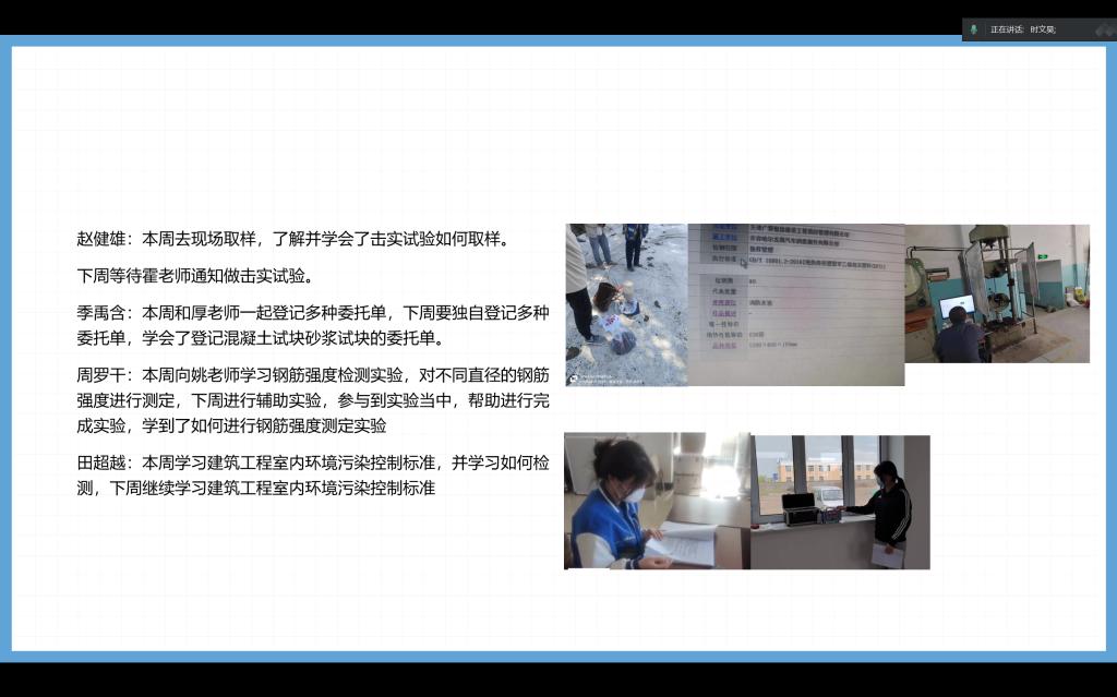 会议共有三项进程。首先,郝欣老师便针对入岗打卡,每日一学等实践任务做出总结。随后,由30名同学,共计七组依次进行本周实践任务完成进度、工作任务安排以及对工作上的问题进行总结分析等内容的汇报,同时郝欣老师针对每位同学的汇报进行专业上的指导。最后,郝欣老师便针对本周实践情况做出总结与下一周的实践任务安排。