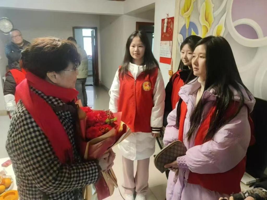志愿者们带着满心的敬意与关怀,踏入了烈士父母的家中。送上了暖心的慰问品和慰问金,鄢欣悦为他们戴上红色围巾,一起挂上“光荣之家”红灯笼,并端上了一碗热气腾腾的长寿面。