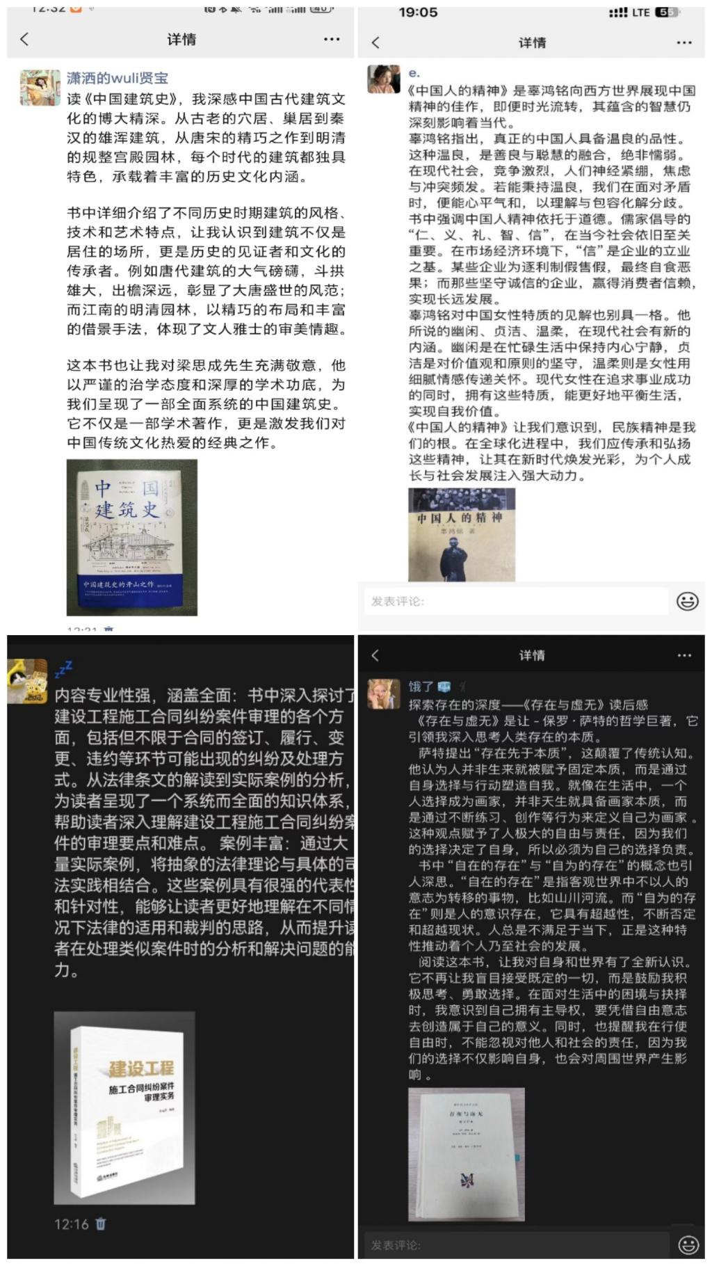 活动过程中,小组成员们依次分享了自己在本周阅读的与社会实践主题相关的书籍。有的成员分享了关于中国建筑史书籍,详细阐述了不同历史时期建筑的风格;有的则介绍了施工合同纠纷案例,提高我们分析和解决问题的能力。