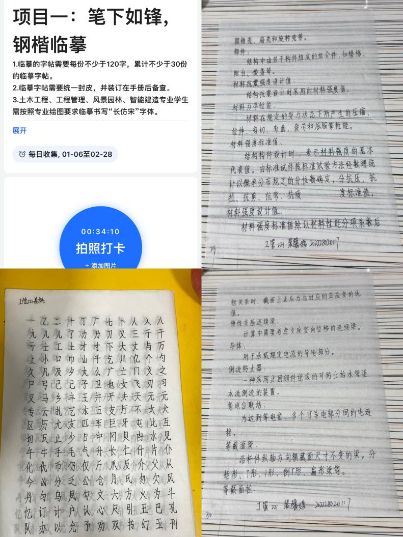 时光荏苒,社会实践学期如约而至,由生涯导师李俊及组长工管221姜烁的带领下,对社会实践学期进行制定计划与完成每日钢楷临摹的书写打卡等内容。